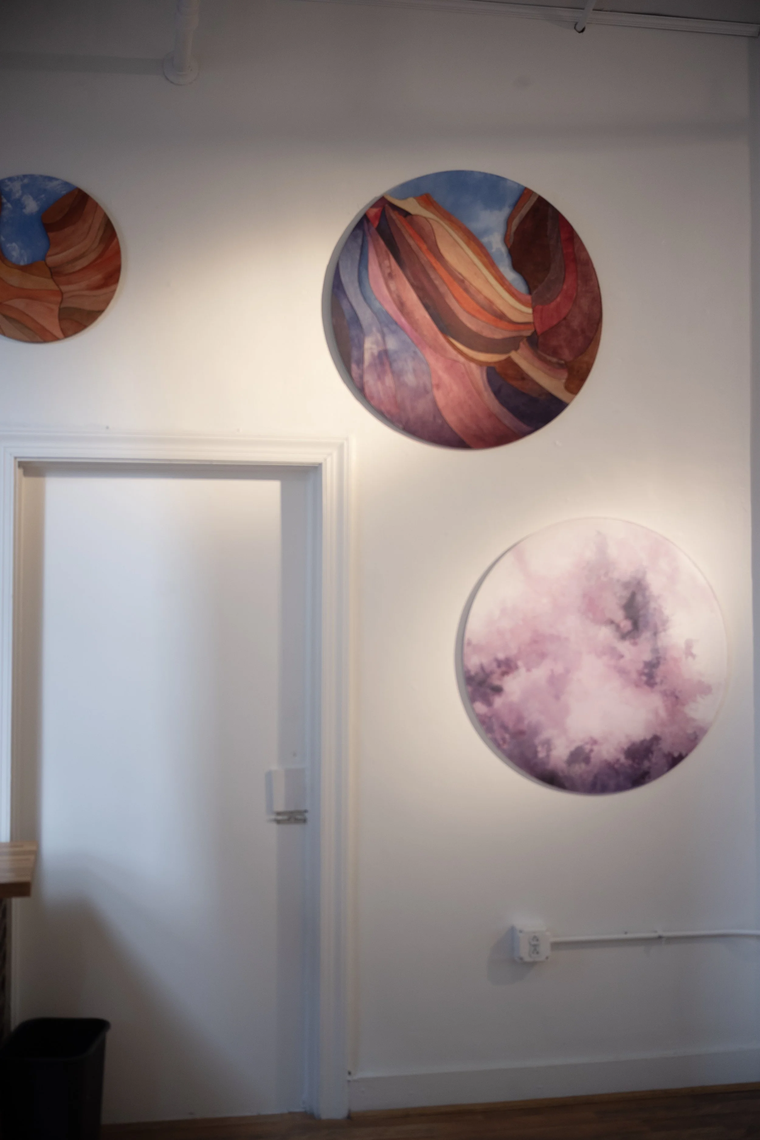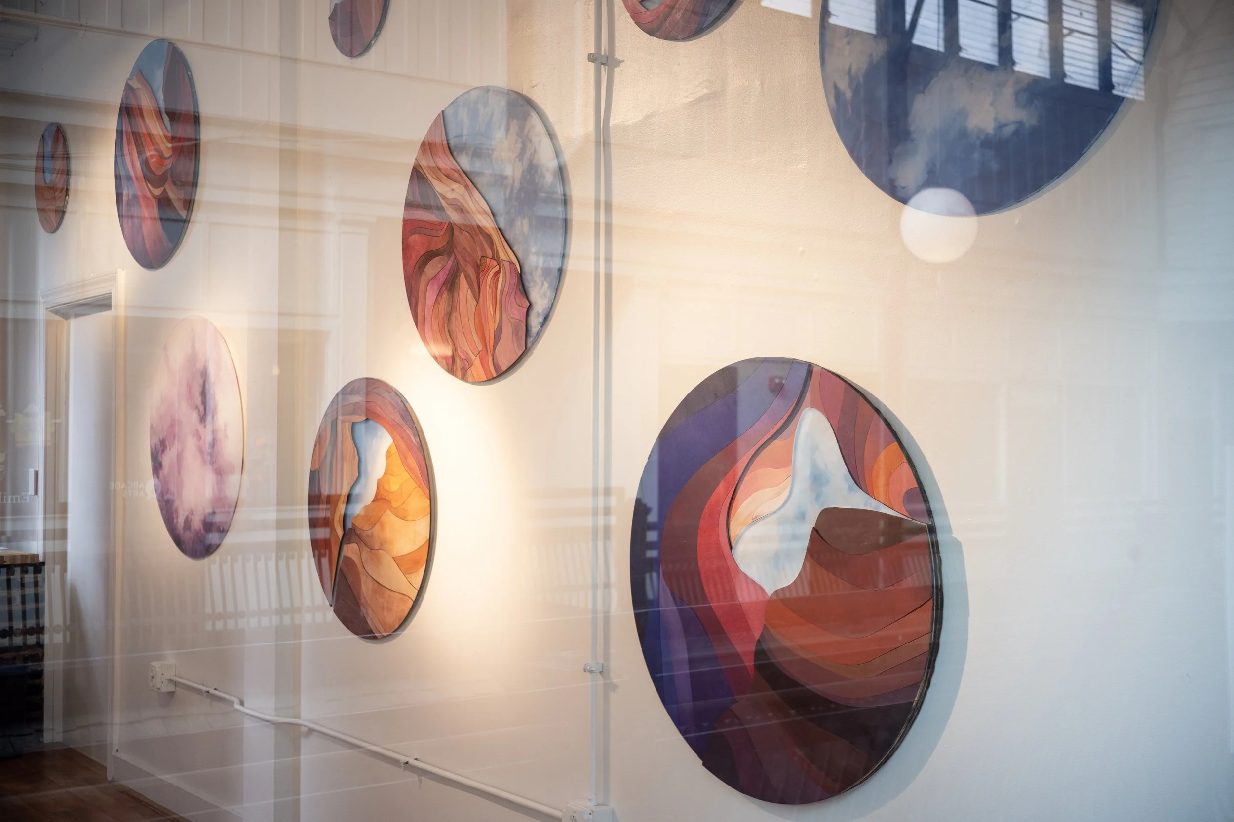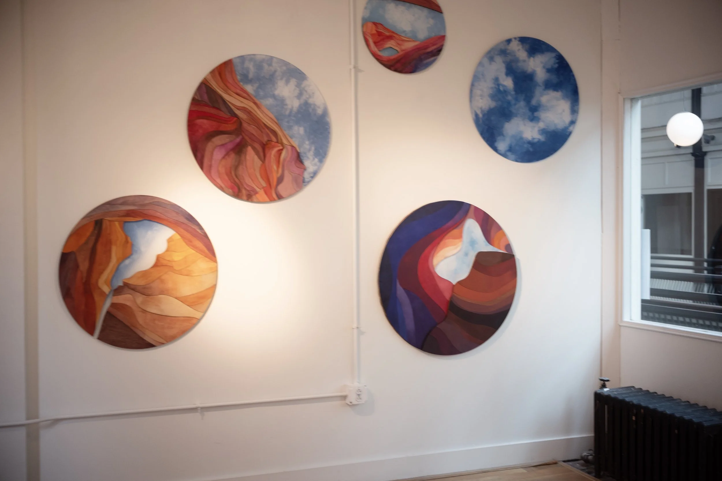 Exhibition Dates: 05.10.2025 - 06.14.2025Arcade Arts: Gallery 56SPECTACLE features Sean Heiser's paintings and Alexis Jones's mixed-media woodworks. Grounded in visual perception and the draw of earthly yet fantastical landscapes, this exhibition brings together artists who use the outer world to connect with their inner selves and foster reciprocity with the life systems around them.Whether giving new life to discarded materials or grounding oneself through sky-looking, the artists collaborate with the earth to forge windows into abstract, organic scapes. As they engage with the sky, plants, or canyons, the artists build worlds of radical beauty and contentment while navigating personal memory. In a world of growing capitalism and individualism, SPECTACLE seeks to disrupt the self-focused, static mind and channels one’s attention towards the power of active spectatorship and portals of mutual exchange.Artist Biographies: